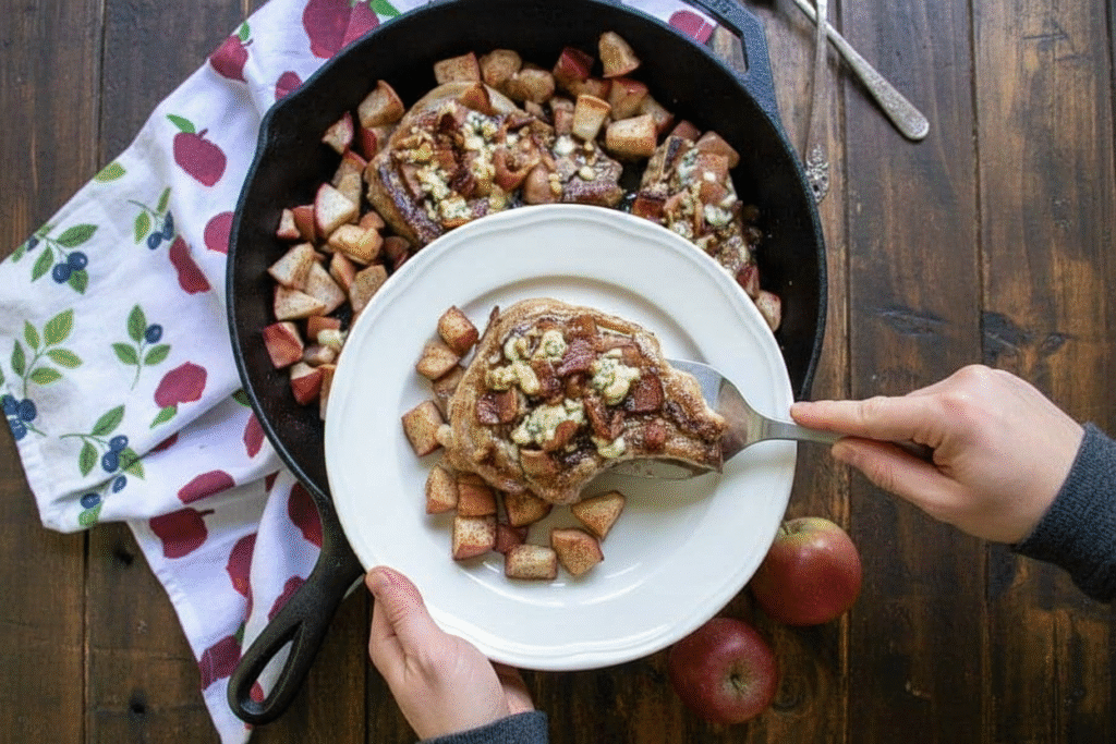 Savory pork chops smothered in a sweet apple, smoky bacon, and tangy blue cheese sauce. A decadent and easy dinner recipe perfect for any night.