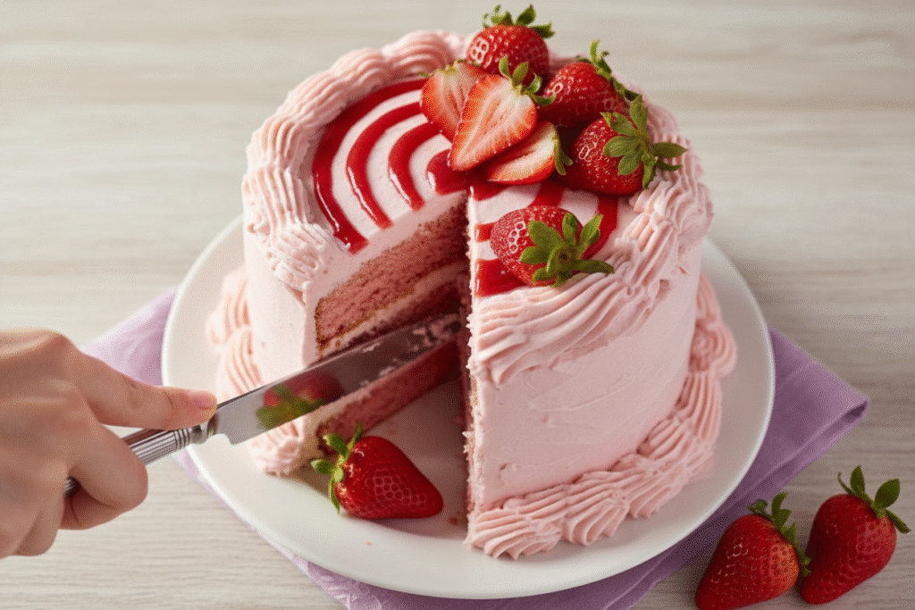 Step 5: Finally, assemble your masterpiece. Frost the top of one cool cake layer. Gently place the second layer on top. Now cover the whole cake with the rest of the frosting. You can add fresh strawberries on top. It looks so pretty. Then slice, serve, and enjoy the smiles.