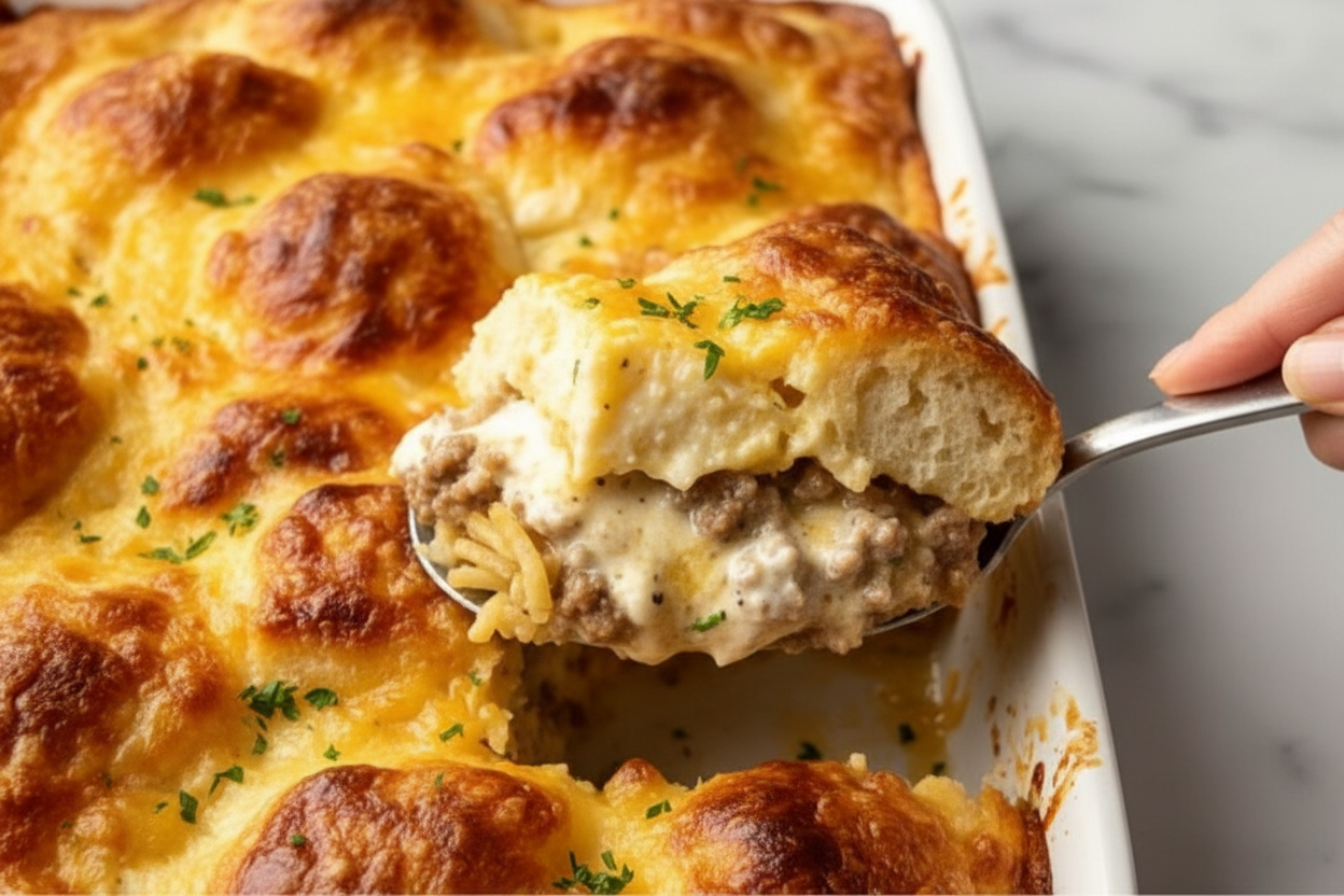 Biscuits and Gravy Hashbrown Breakfast Casserole