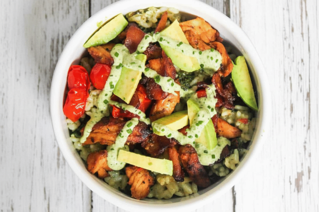 A vibrant, protein-packed rice bowl with crispy bacon, creamy avocado, and a zesty pesto ranch dressing. Perfect for a quick, healthy lunch or dinner.