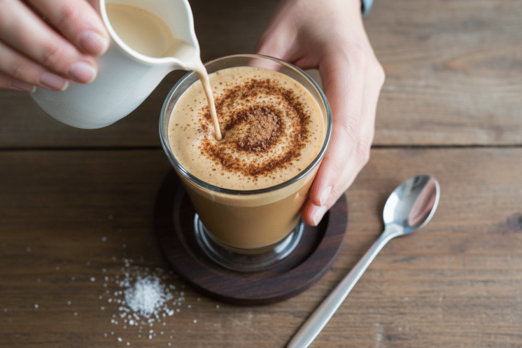 Pour the warm chocolate milk into your cup first. Fill it about halfway. Then slowly pour the cinnamon coffee on top. I love watching the two colors swirl together. It’s like a little show just for you.