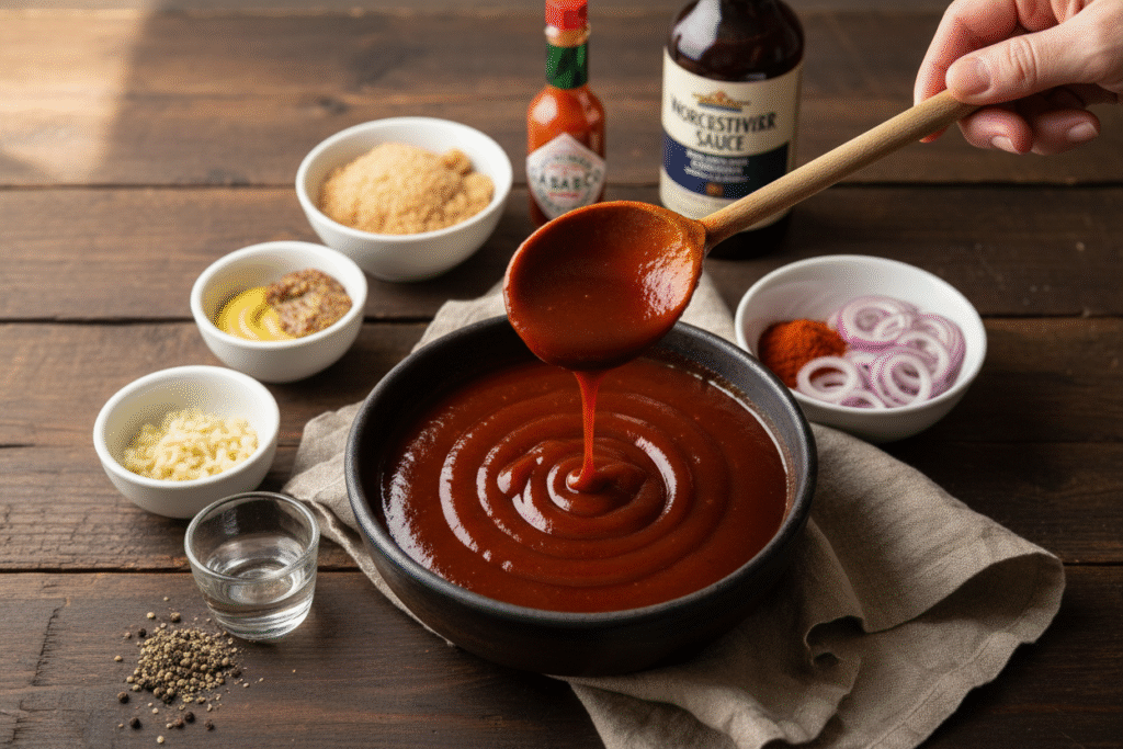 - Once the sauce has thickened, remove it from the heat and taste it. Adjust the seasonings to your preference. You can add more brown sugar for sweetness, more vinegar for tang, or a pinch of cayenne pepper for a kick.