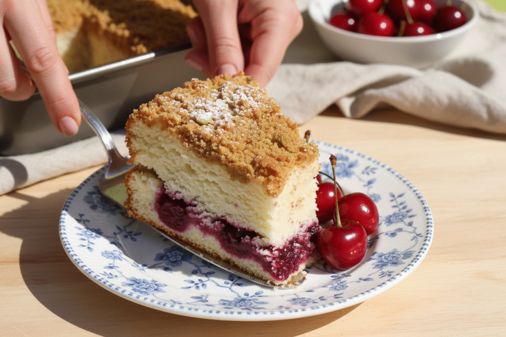 Easy cherry crumb cake bursting with fresh summer cherries! This simple, delicious dessert is perfect for brunch or a sweet treat.