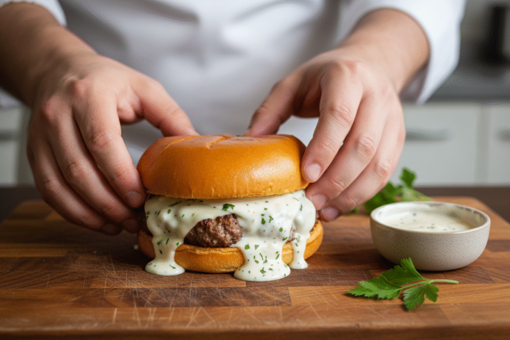 - Bringing it all together: Place burgers on bottoms of brioche buns. Spoon Creamy Garlic Burger Sauce over burger. Top with the top of the brioche bun.