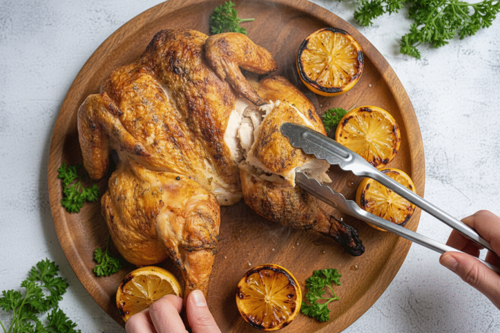 - Step 6: Move the chicken to a platter. Let it rest for 10 minutes. This keeps all the juicy goodness inside. Then carve it up and serve. Doesn’t that smell amazing? You did it!