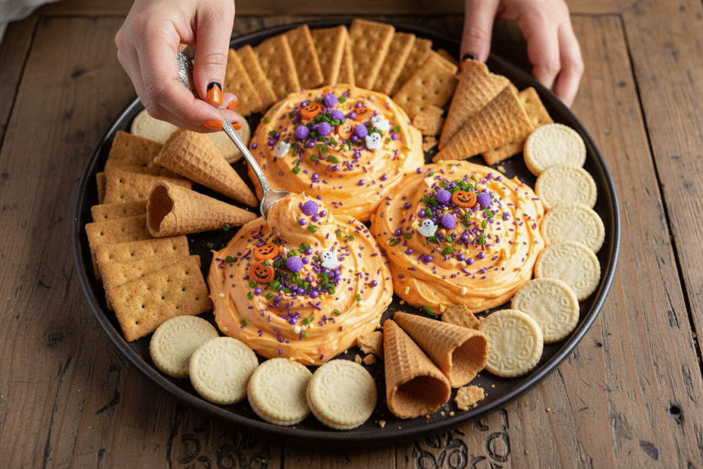 Presentation is part of the fun. Place your bowl on a big platter. Scatter extra sprinkles around it. Add a few plastic spiders for a giggle. For dippers, try apple slices or pretzel rods too. They give a nice salty crunch.