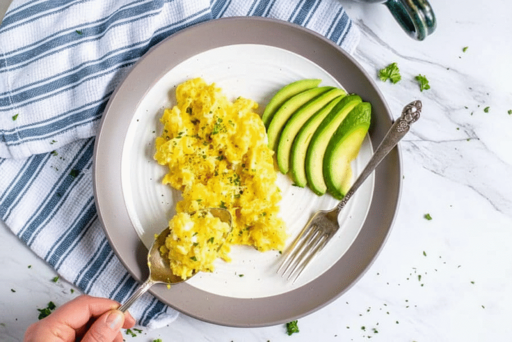 Creamy, high-protein scrambled eggs with cottage cheese! A healthy, easy breakfast recipe perfect for meal prep.