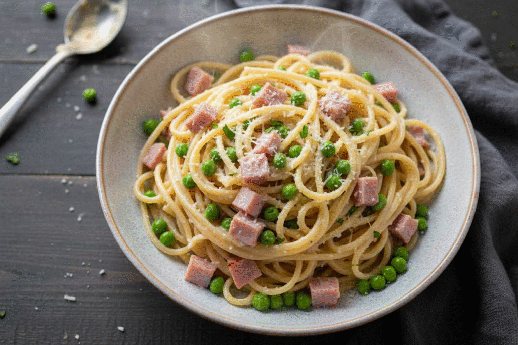 This dish is like a friendly blank page. You can add what you love. Try cooked broccoli instead of peas. Use leftover chicken instead of ham.