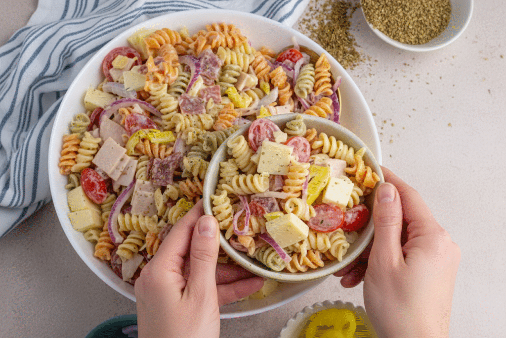 Step 1: Boil a big pot of water for your rotini. Cook it just like the package says. Then drain it and rinse with cold water. This stops the cooking and cools it right down. (My hard-learned tip: rinse until the pasta feels cool to your fingers. No one likes a warm, soggy salad!). Step 2: Now, let’s make the magic dressing. Grab a small bowl. Whisk the mayo, vinegar, and banana pepper juice together. Then add the garlic powder and oregano. Keep whisking until it’s smooth and creamy. This tangy dressing is the secret. Step 3: Time for chopping! Cut the salami, turkey, and provolone into little squares. Make them all about the same size. This way, you get a perfect bite every single time. My grandkids fight over the cheese pieces. Do you like more meat or more cheese? Share below! Step 4: Let’s prep our veggies. Slice the red onion very thinly. Then cut the cherry tomatoes in half. Chop up those banana pepper rings, too. Their little kick makes the whole salad sing. Step 5: Bring everything to the party! Use your biggest mixing bowl. Add the cool pasta, all the meats, cheese, and your fresh veggies. Gently toss them with your hands or a big spoon. See how colorful it is already? Step 6: Pour your dressing right over the top. Now, toss everything together until it’s all shiny and coated. Be gentle but thorough. You want every noodle to get in on the fun. I always take a tiny taste here. Sometimes I add one more pinch of oregano. Step 7: You can eat it right away. Or cover the bowl and let it chill in the fridge. The flavors get even better as they wait. It’s the perfect make-ahead dish for a busy day. Cook Time: 10 minutesTotal Time: 25 minutes