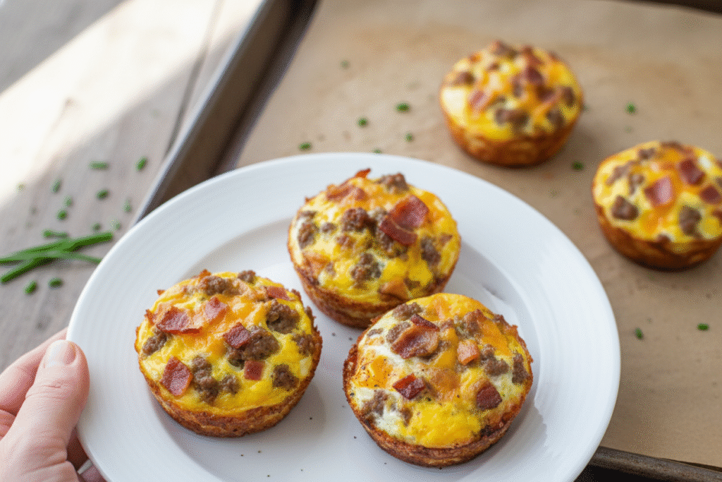 Bake those walls until they’re golden. Doesn’t that smell amazing? Let them cool a bit. Then, the fun part. Crack one egg right into each crispy cup. Top it with crumbled bacon, sausage, and more cheese. So easy!