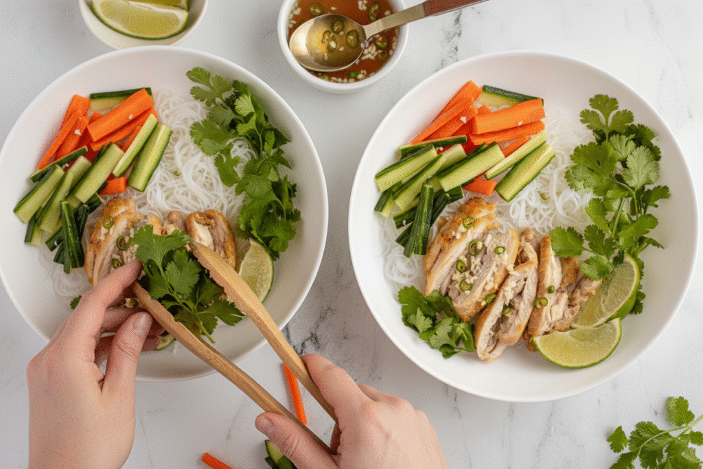 - Assemble the bowls: Slice the rested chicken. Add cooked noodles to each bowl, top with chicken, cucumber, carrots, cilantro, and a lime wedge. Serve with the prepared Nuoc Cham.