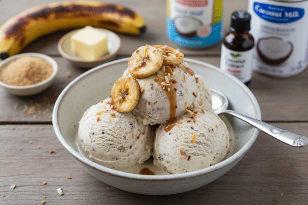 Creamy dairy-free ice cream with rich roasted bananas and tropical coconut. An easy, decadent vegan dessert that tastes like paradise.