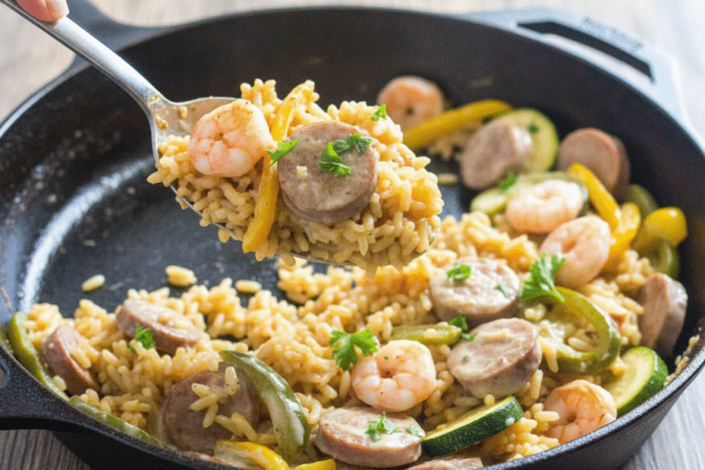 This one-pan wonder combines savory sausage, juicy shrimp, and fresh veggies with creamy, cheesy rice for an easy, flavor-packed dinner the whole family will love.