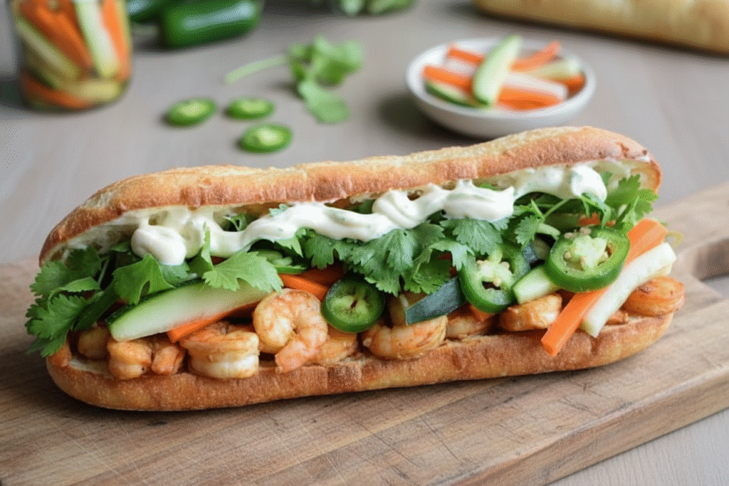 A vibrant Shrimp Banh Mi recipe with quick pickled vegetables! Easy, fresh, and packed with flavor for a delicious lunch or dinner.
