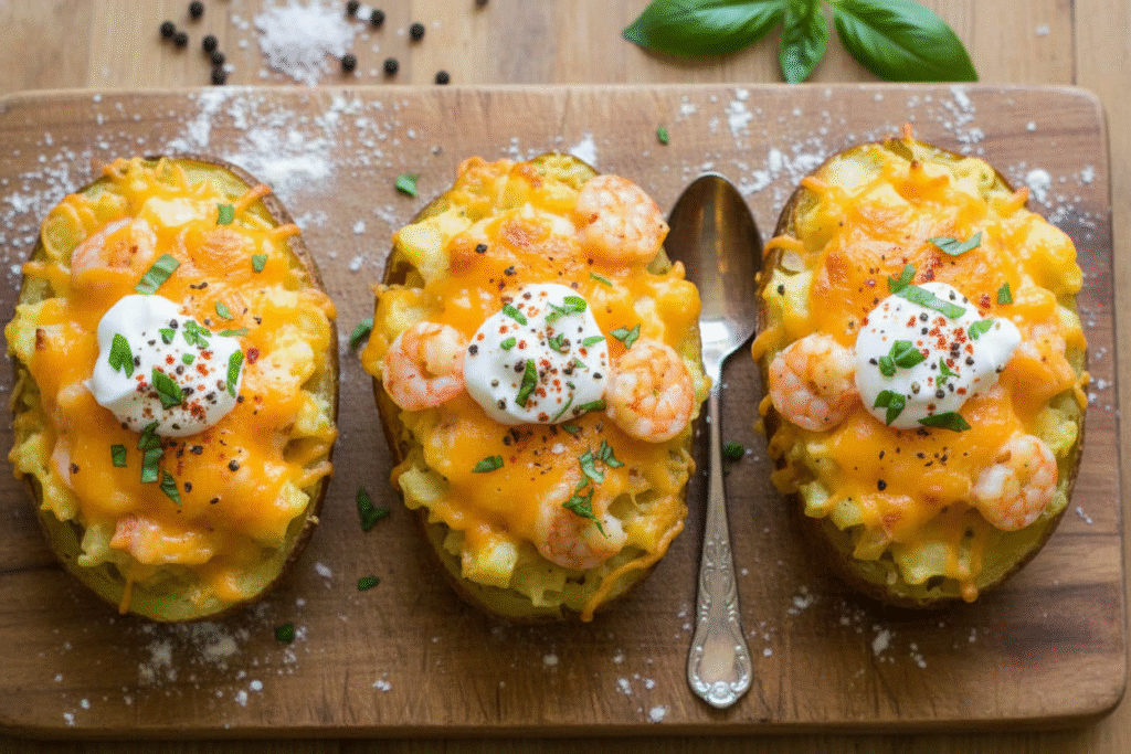 Step 4: Gently fold in your cooked shrimp. Be kind so they don’t break. Then spoon the filling back into your potato boats. Don’t pile it too high. They might spill over in the oven. A little extra cheese on top makes everything better.