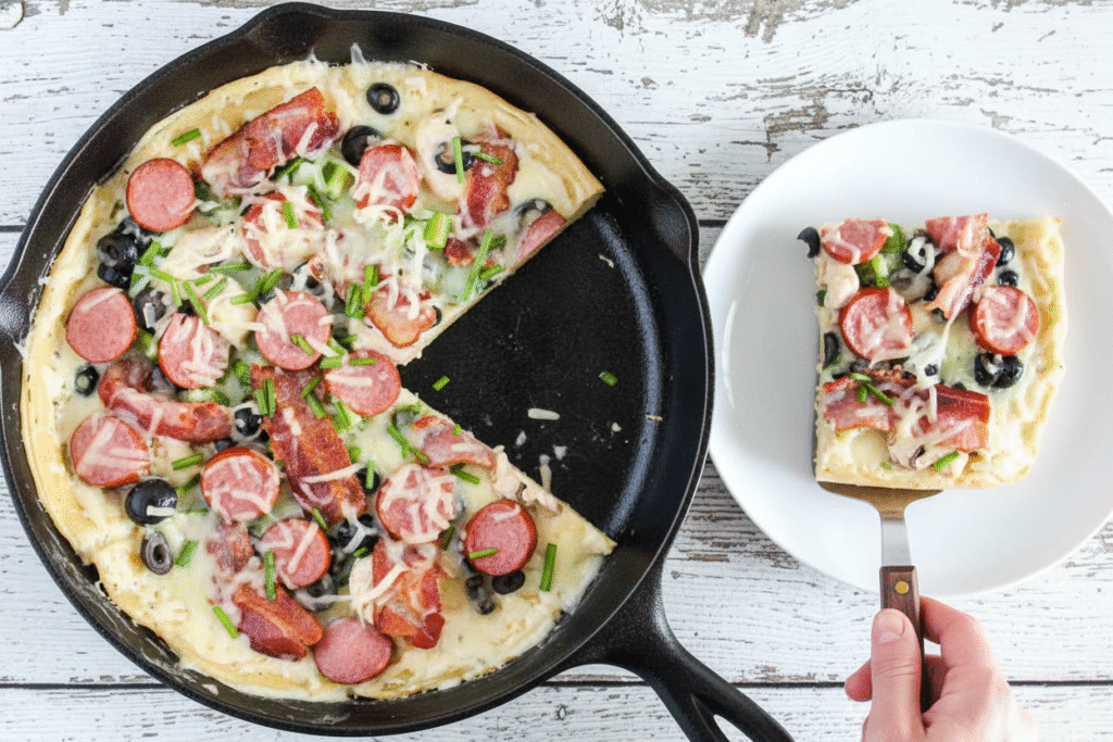 Let the pizza cool for a few minutes. This is the hardest part! But it lets the cheese set. Then you can slice it cleanly. The skillet keeps it warm for a long time.