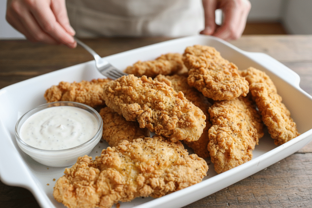- Step 4: The double dip! Dip a chicken strip in the wet mix. Coat it completely. Then, roll it in the dry ranch flour. Now, do it all again! A quick second dip in the wet, then back in the dry. This double layer is the magic. It makes the crust extra crunchy and perfect.