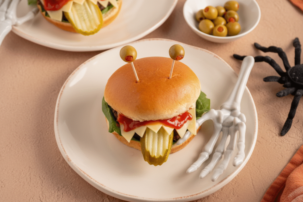 - Assemble the Monster Burgers: Lay a piece of romaine lettuce on the bottom half of each bun. Place a burger patty on top of the lettuce. Add a pickle slice over the patty, positioning it so that it sticks out like a monster tongue. Place the cheese slice with teeth on top of the pickle, letting the jagged edge hang over the side. Spread a little ketchup on top of the cheese for a “bloody” effect. Add the top bun, then push the toothpicked olives into the top bun as eyes.