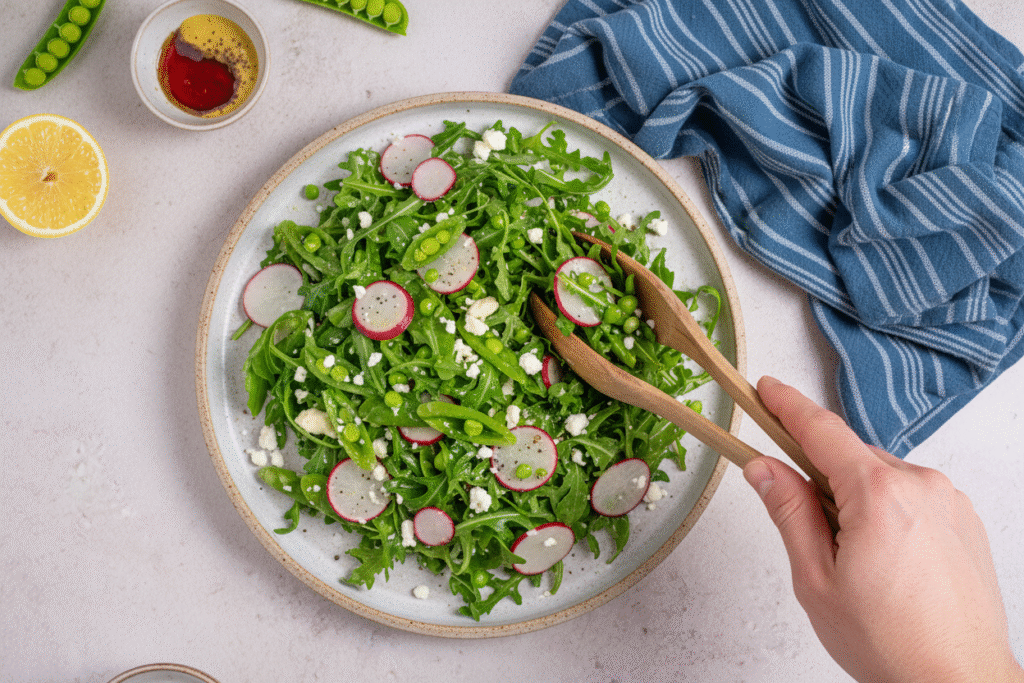 Step 3: Wash your radishes. Slice them as thin as you can. They add a lovely pink color and a little bite. Now, put the arugula in your big salad bowl. Add the sliced peas and radishes. Sprinkle the crumbled feta cheese over the top. That salty feta is the perfect touch. What’s your favorite crunchy vegetable? Share below!