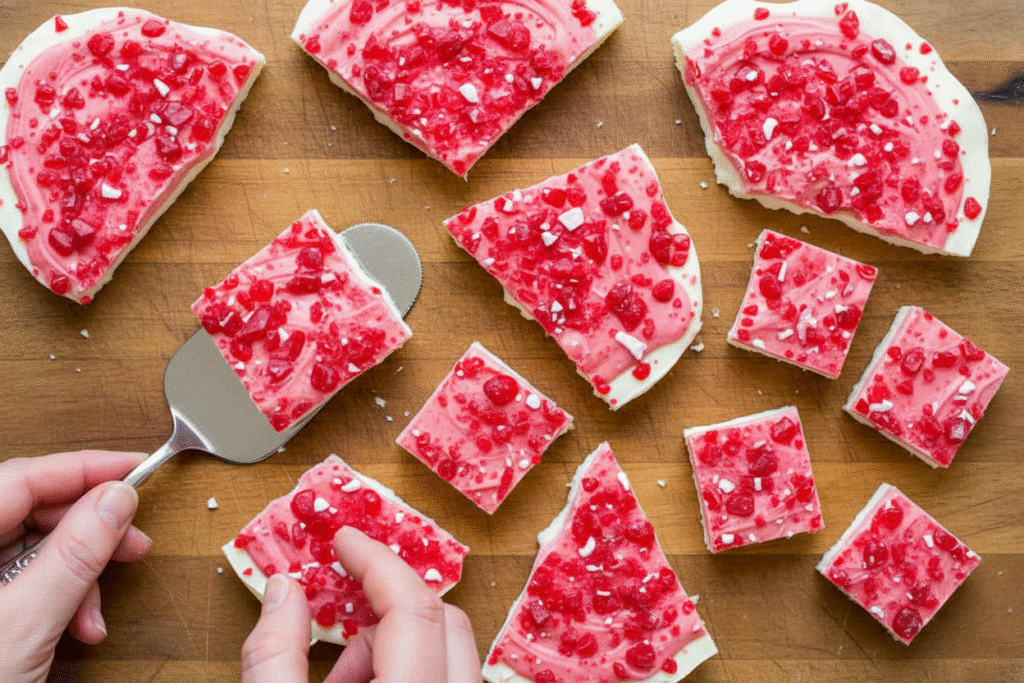 - Step 4: Spread the pink mix over the white layer. Work fast before it starts to set. Now, sprinkle all those crushed cherry candies on top. Use your spatula to press them in gently. Do you think the candy goes on the warm or cold layer? Share below!