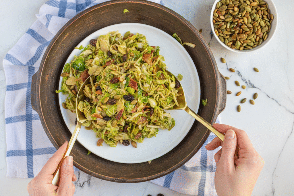 Time to bring it all together. Get a big mixing bowl. Put in the warm sprouts, pumpkin seeds, and raisins. Crumble in that crispy bacon with your fingers. Drizzle your shiny dressing over everything. Gently toss it all until every bit is coated. Serve it right away. The warmth makes the raisins so plump and sweet.